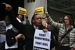 In general terms, methods of protest by HIV/AIDS activists have included marching with placards at appearances of political leaders (or at "a 'Pride' march"), leafletting, the distribution of art projects, the hanging of certain politicians in effigy, sit-ins, and die-ins among other activities. Such activism may be regarded as in some sense "revolutionary".[2][6] During die-ins, protesters lie motionless in the street, often blocking traffic, or in the aisles of a church (such as at ACT UP's 1989, Stop the Church action), to symbolize all the people who have died of AIDS.[7][2]