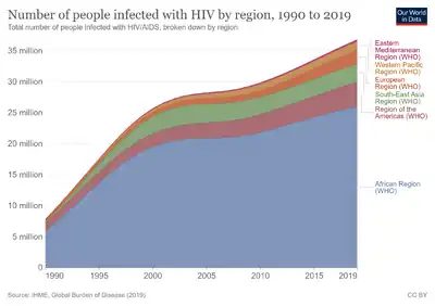 In 2005, the estimated adult HIV prevalence rate in Myanmar was 1.3% (200,000–570,000 people) according to UNAIDS, and early indicators show that the epidemic may be waning in the country, although the epidemic continues to expand in parts of the country.[29][30][31] An estimated 20,000 (range between 11,000 and 35,000) die from HIV/AIDS annually.[32]