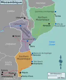 HIV rates vary drastically by region, with southern Mozambique (City of Maputo, Maputo Province, Gaza, and Ingambane) containing the highest rate of infection (21 percent), central Mozambique (Manica, Sofala, Tete, and Zambézia) containing the second highest (18 percent), and northern Mozambique (Nampula, Niassa, and Cabo Delgado) containing the lowest (9 percent).[4][1][9] The highest rates within the country occur within Sofala, a central province with a rate of 26.5 percent. Rate disparities are attributed to numerous factors such as: population displacement after the Mozambican civil war, ease of access to various regional provinces, similarities in health facilities, presence of groups with high risk of HIV infection in certain provinces, and similarities in social, cultural, economic, and educational levels that might impact the degree to which individuals are informed about the methods for transmission and prevention of HIV.[13][9] Further, urban and district hospitals tend to have much greater ease of access to the HIV medications nevirapine and zidofudine as opposed to more rural areas of the nations. Moreover, the HIV/AIDS epidemic in Mozambique is predominantly spread heterosexually (in nearly 90 percent of adult cases) and through vertical transmission.[1][12] Mozambique has the 8th highest HIV rate in the world, an 11.5 percent rate of HIV infection within adults aged 15 to 49, an estimated total of 34,000 AIDS-related deaths in individuals 15 years or older, and approximately 802,659 adults living with HIV on ART.[1][2][14]