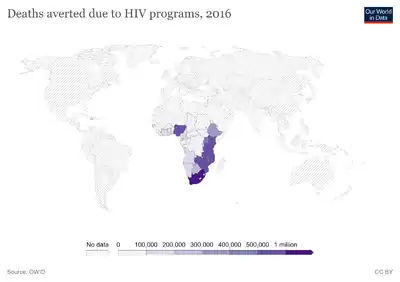 Mozambique's first case of HIV was reported in 1986 in the Cabo Delgado province. By the year 2001, HIV had infected more than one million people, 53,000 of which were children under 18 years of age and 570,000 of which were women.[8] The first governmental response to the HIV/AIDS epidemic occurred in 1988 with the establishment of four sentinel surveys in Maputo, Beira, Chimoio, and Tete to keep track of HIV rates within the country.[9] In 2004, antiretroviral therapy (ART) medications became publicly available throughout the nation, after having been limited to pilot programs for some years, with the help of international funding. Before the nationwide introduction of ART, only cotrimoxazole prophylaxis Archived 2022-01-19 at the Wayback Machine and drugs to diminish the effects of opportunistic infections were administered to people living with HIV/AIDS (PLWHA). In 2006, opt-out HIV diagnostic tests were offered to pregnant women for the first time. Several campaigns and organizations have launched since 1986 to combat the HIV epidemic in various ways, and by reaching various sectors of Mozambican society.[10] Yet, since the end of the civil war in 1992, rural areas of Mozambique continue to face repercussions of the HIV/AIDS epidemic, prominently due to the inability of the nation to quickly rehabilitate as a result of inadequate funds allocated towards addressing both educational and healthcare system infrastructural repairs.[1]