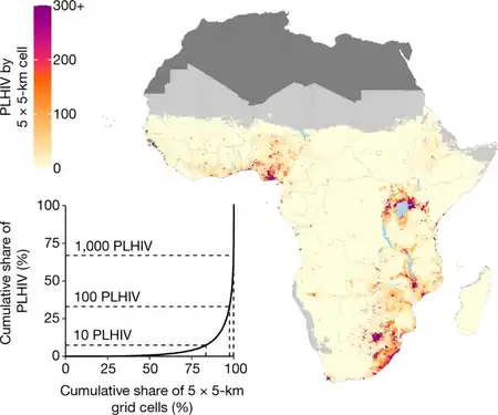 - ↑ Dwyer-Lindgren, Laura; Cork, Michael A.; Sligar, Amber; Steuben, Krista M.; Wilson, Kate F.; Provost, Naomi R.; Mayala, Benjamin K.; VanderHeide, John D.; Collison, Michael L.; Hall, Jason B.; Biehl, Molly H.; Carter, Austin; Frank, Tahvi; Douwes-Schultz, Dirk; Burstein, Roy; Casey, Daniel C.; Deshpande, Aniruddha; Earl, Lucas; El Bcheraoui, Charbel; Farag, Tamer H.; Henry, Nathaniel J.; Kinyoki, Damaris; Marczak, Laurie B.; Nixon, Molly R.; Osgood-Zimmerman, Aaron; Pigott, David; Reiner, Robert C.; Ross, Jennifer M.; Schaeffer, Lauren E.; Smith, David L.; Davis Weaver, Nicole; Wiens, Kirsten E.; Eaton, Jeffrey W.; Justman, Jessica E.; Opio, Alex; Sartorius, Benn; Tanser, Frank; Wabiri, Njeri; Piot, Peter; Murray, Christopher J. L.; Hay, Simon I. (June 2019). "Mapping HIV prevalence in sub-Saharan Africa between 2000 and 2017". Nature. 570 (7760): 189–193. doi:10.1038/s41586-019-1200-9. ISSN 1476-4687.