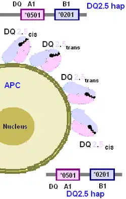 As mentioned the DQA1*0501:DQB1*0201 haplotype produces DQ2.5cis which by frequency and efficiency in alpha-gliadin presentation is the major factor in adaptive immunity. The isoform, referred to frequently as the DQ2 heterodimer or DQ2 (DQA1*05:DQB1*02) and more recently DQ2.5 can be differentiated from responses from other DQ isoforms, including other DQ2.[8][9] Specifically, that this DQ2 heterodimer is responsible for presenting the α2-gliadin that most effectively stimulates pathogenic T-cells.