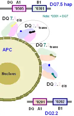The DQ2.2/DQ7.5 phenotype. Also called DQ2.5trans in some publications. DQ7.5 haplotype is the DQA1*0505:DQB1*0301 haplotype. The DQA1*0505 allele is similar to the DQA1*0501 allele of the DQ2.5 haplotype. When DQA1*0505 or DQA1*0501 gene products are processed to the cell surface they become α5. The gene products of DQB1*0202 and DQB1*0201 are almost identical and function similarly. As a result, one isoform produced by the phenotype of two haplotypes, DQ2.2/DQ7.5, is HLA DQ α5β2. A small percentage of coeliac disease patients have this haplotype. The other 3 isoforms are α2β2(DQ2.2), α2β7 (DQ7.2), and α5β7 (DQ7.5).