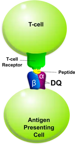 When tolerance to self proteins is lost, DQ may become involved in autoimmune disease. Two autoimmune diseases in which HLA-DQ is involved are coeliac disease and type 1 diabetes. DQ mediates autoimmunity by skewing the T-cell receptor (TCR) repertoire during thymic selection.[1] Carriers of risk serotypes such as DQ8 have a higher proportion of circulating T-cell receptors that may bind insulin, the primary autoantigen in type 1 diabetes.