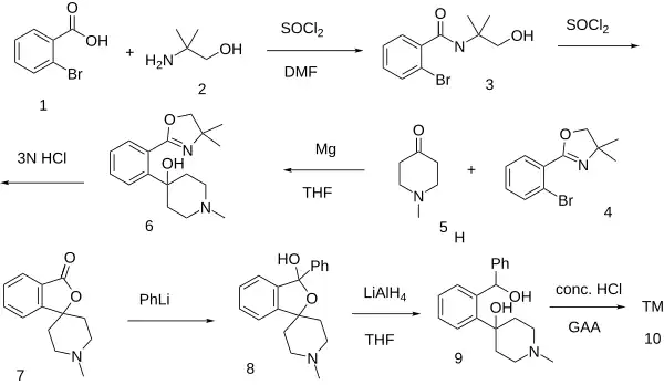 - ↑ Klioze SS, Bauer VJ, Geyer HM (April 1977). "Synthesis of spiro[isobenzofuran-1(3H),4'-piperidines] as potential central nervous system agents. 2. Compounds containing a heteroatom attached to nitrogen". Journal of Medicinal Chemistry. 20 (4): 610–612. doi:10.1021/jm00214a039. PMID 850252.