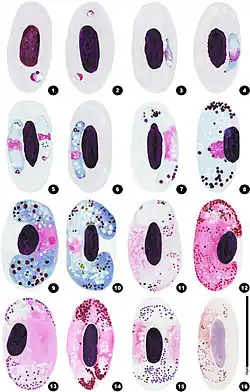 Only gametocytes are found in the blood. Asexual reproduction occurs in body organs, especially the liver. The organisms occupy the majority of the cytoplasm, leaving the light magenta, finely granular, pink nucleus centrally located.