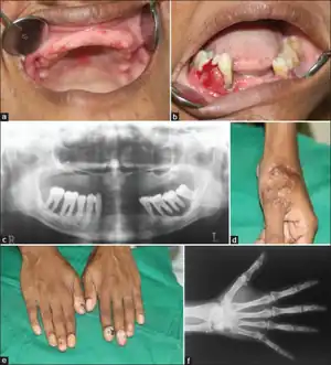 | a) edentulous maxilla, b) aggressive periodontitis, c)orthopantomogram of maxilla , d) healed lesion,e) onychogryphosis of fingers, x-ray of wrist | |