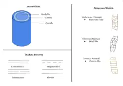 Hair consists of various characteristics that can be of use in a forensic examination and analysis. To the core, hair is composed of keratin, water, minerals, and lipids. [3] Hair consist of two distinctions parts, the hair shaft and the hair root. [4] The shaft is composed of 3 layers, first being the medulla which is the inner core (if present), the second being the cortex which is the middle layer composed of multiple cells, and then lastly the cuticle which is the outer layer. [4] The hair root is the bulbous portion of the hair shaft that resides in the hair follicle with the surrounding cells in the hair follicle that allow for production of hair and its growth. [4] There are three phases of hair growth; anagen, catagen and telogen. In the anagen phase, the hair root actively creates the hair shaft. [4]In the catagen and telogen phases, it regresses and gets ready for the following cycle. [3][4] As hair shedding is a natural process, hairs tend to be found in the anagen phase when collected for analysis rather than the regression phase . [3]This can cause issues in analysis as the follicular tag which is located on the hair follicle must be present to be able to analyze it with DNA analysis.[4] If no follicular tag is present, the hair is sent for mitochondrial DNA (mt-DNA), as this is the only way to truly identify there source of hair. In theory, all human hairs are suitable sources for mitochondrial DNA.