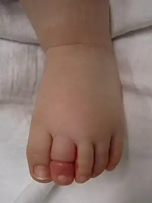 Hair tourniquet is a condition where hair or thread becomes tightly wrapped around most commonly a toe, and occasionally a finger, genitals, or other body parts.[1] This results in pain and swelling of the affected part.[1] Complications can include tissue death due to lack of blood flow.[1] It occurs most commonly among children around 4 months of age,[1] though cases have been described in older children and adults.[2]