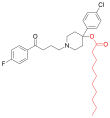 The decanoate ester of haloperidol (haloperidol decanoate) has a much longer duration of action, so is often used in people known to be noncompliant with medication by mouth. A dose is given by intramuscular injection once every two to four weeks.[36] The IUPAC name of haloperidol decanoate is [4-(4-chlorophenyl)-1-[4-(4-fluorophenyl)-4-oxobutyl]piperidin-4-yl] decanoate.