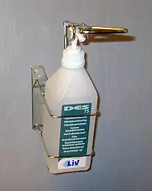 Alcohol has been used as an antiseptic at least as early as 1363 with evidence to support its use becoming available in the late 1800s.[15] Alcohol-based hand sanitizer has been commonly used in Europe since at least the 1980s.[16] The alcohol-based version is on the World Health Organization's List of Essential Medicines.[17] The wholesale cost in the developing world is about US$1.40–3.70 per liter bottle.[18][10]