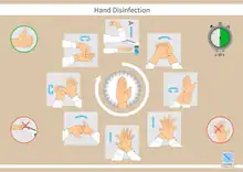 Medical hand-washing is for a minimum of 15 seconds, using generous amounts of soap and water or gel to lather and rub each part of the hands.[74] Hands should be rubbed together with digits interlocking. If there is debris under fingernails, a bristle brush may be used to remove it. Since pathogens may remain in the water on the hands, it is important to rinse well and wipe dry with a clean towel.[75] After drying, the paper towel should be used to turn off the water (and open any exit door if necessary). This avoids re-contaminating the hands from those surfaces.