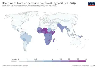 In developing countries, hand washing with soap is recognized as a cost-effective, essential tool for achieving good health, and even good nutrition.[29] However, a lack of reliable water supply, soap or hand washing facilities in people's homes, at schools and the workplace make it a challenge to achieve universal hand washing behaviors. For example, in most of rural Africa hand washing taps close to every private or public toilet are scarce, even though cheap options exist to build hand washing stations.[60] However, low hand washing rates can also be the result of engrained habits rather than due to a lack of soap or water.[88]