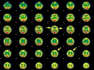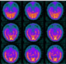 | Brain SPECT transaxial images of a patient afflicted with Hashimoto's encephalopathy. | |