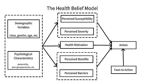 In social psychology, the health belief model (HBM) is a psychological framework used to explain and predict individuals' potentially detrimental behaviors, attitudes and beliefs on their health. Developed in the 1950s by social psychologists at the United States Public Health Service, the model examines how perceptions of susceptibility to illness, the severity of health conditions, the benefits of preventive care, and barriers to healthcare influence behavior. The HBM is widely used in health behavior research and public health interventions to understand and promote engagement in health-protective behaviors.[1][2] It also incorporates concepts similar to the transtheoretical model like self-efficacy, or confidence in one's ability to take action, and identifies the role of cues to action or stimulus, such as health campaigns or medical advice, in prompting behavior change.[3]