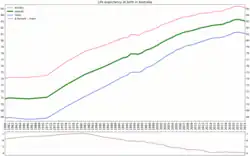 Australia's life expectancy is approximately 83 years, however 10 of these years are expected to include an increase in disability from a chronic disease. The increase in chronic diseases are a contributor of higher healthcare costs overall.[61] Additionally the older generation shows an increased need for health services, and utilizes services frequently. From the years 1973 to 2013 the total number of people 65 or older tripled, increasing from 1.1 million to 3.3. As for the population of 85 and older there was an increase from 73,100 to 439,600. In order for the Australian health care system to handle the gradual population aging, government and administration must develop new policies and programs to accommodate the needs of changing demographics.[13]