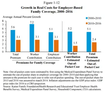 The President's Council of Economic Advisors (CEA) described how annual cost increases have fallen in the employer market since 2000. Premiums for family coverage grew 5.6% from 2000-2010, but 3.1% from 2010-2016. The total premium plus estimated out-of-pocket costs (i.e., deductibles and co-payments) increased 5.1% from 2000-2010 but 2.4% from 2010-2016.[40]