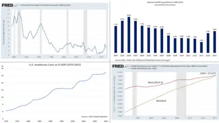 - ↑ 5.0 5.1 "Federal Reserve Data FRED-CPI All Urban Consumer:Medical Care-Retrieved October 26, 2017". Archived from the original on August 10, 2019. Retrieved March 9, 2023.