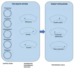 In "Getting Health Reform Right: A Guide to Improving Performance and Equity,"[2] Marc Roberts, William Hsiao, Peter Berman, and Michael Reich of the Harvard T.H. Chan School of Public Health aim to provide decision-makers with tools and frameworks for health care system reform. They propose five "control knobs" of health reform: financing, payment, organization, regulation, and behavior.[2] These control knobs refer to the "mechanisms and processes that reformers can adjust to improve system performance".[2] The authors selected these control knobs as representative of the most important factors upon which a policymaker can act to determine health system outcomes.
