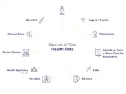 Prior to recent technological advances, most health data were collected within health care systems. As individuals move through health care systems, they interact with health care providers and this interaction produces health information. These touch points include clinics/physician offices, pharmacies, payers/insurance companies, hospitals, laboratories, and senior homes. Information is also collected through participation in clinical trials, health agency surveys, medical devices, and genomic testing. This information, once recorded, becomes health data. This data typically includes a record of services received, conditions of those services, and clinical outcomes consequent of those services.[2] For example, a blood draw may be a service received, a white blood cell count may be a condition of that service, and a reported measurement of white blood cells may be an outcome of that service. Information also frequently collected and found in medical records includes, administrative and billing data, patient demographic information, progress notes, vital signs, medications diagnoses, immunization dates, allergies, and lab results.[6]