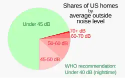 More than a quarter of US residences have average outside noise levels exceeding the maximum nighttime outside noise level recommended by the World Health Organization.[1]