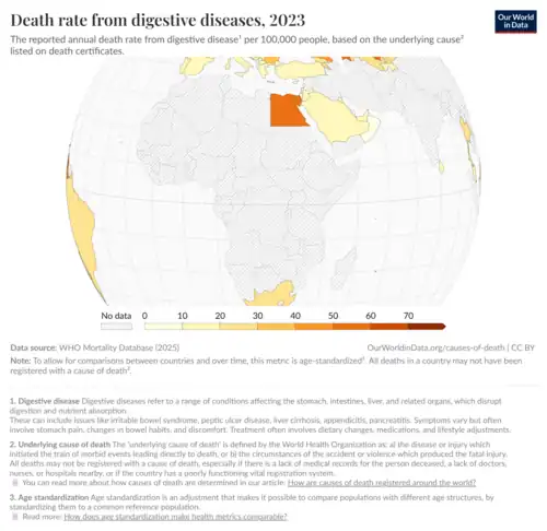 Digestive diseases in Egypt include a mix of infectious and chronic conditions, with bacterial diarrhea, typhoid fever and schistosomiasis being widespread due to water and food contamination. Chronic illnesses like ulcerative colitis and Crohn’s disease are rising, with bloody diarrhea as a common symptom[1][2]