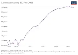 Health in Egypt encompasses the overall well-being of the country's population. As of 2024, the average life expectancy in Egypt is 75 years, with 73.8 years for males and 76.2 years for females.[3] Healthcare access has significantly expanded in both urban and rural areas, supported by immunization programs that now cover 98% of the population. Life expectancy has increased from 45 years in the 1960s, reflecting advancements in medical services, disease prevention, and public health initiatives. The infant mortality rate has also declined substantially, falling from 101–132 deaths per 1,000 live births in the 1970s and 1980s to 50–60 per 1,000 in 2000, and further decreasing to 16–18 per 1,000 in 2024.[4][3]