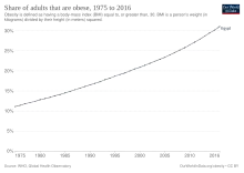 In 1996, Egypt had the highest average BMI in the world at 26.3.[28] In 1998, 1.6% of 2- to 6-year-olds, 4.9% of 6- to 10-year-olds, 14.7% of 10- to 14-year-olds, and 13.4% of 14- to 18-year-olds were obese. 45% of urban women and 20% of the rural population were obese.[29]