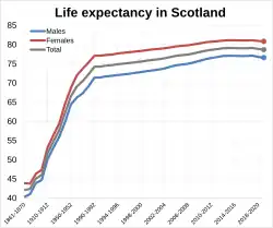 Across Scotland, there are significant differences within health outcomes between the most deprived and wealthiest areas of the country. Scotland has a significantly shorter life expectancy amongst the countries of the United Kingdom as well as the rest of Western Europe.[1] The Scottish Government has introduced a number of measures, including the establishment of Public Health Scotland in April 2020 as the public health agency responsible for increasing healthy life expectancy and reduce premature mortality.[2] Public Health Scotland acknowledge that Scotland has a "number of significant public health challenges" including drug related deaths, environmental sustainability and climate change.[3]