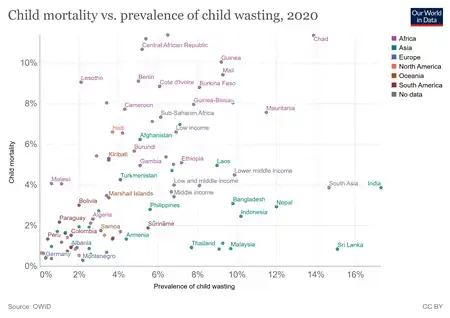 - Food insecurity: Climate change affects agricultural productivity, leading to food shortages and consequent malnutrition. This issue has been prominent in conflict zones. The civil war in Sudan, which started in 2023, caused an economic crisis and a shortage of health services,[46] exacerbating the existing problem.[47][48]