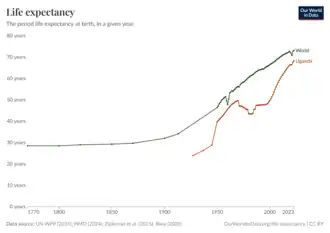 According to the recently conducted national survey in 2024, Uganda's population stands at 45.9 million.[1] Health status is measured by some of the key indicators such as life expectancy at birth, child mortality rate, neonatal mortality rate and infant mortality rate, maternal mortality ratio, nutrition status and the global burden of disease. The life expectancy of Uganda has increased from 39.3 in 1950 to 62.7years in 2021.[2] This is lower below the world average which is at 71.0 years.[2] The fertility rate of Ugandan women slightly increased from an average of 6.89 babies per woman in the 1950s to about 7.12 in the 1970s before declining to an estimate 4.3 babies in 2019.[3] This figure is higher than the world average of 2 and most world regions including South East Asia, Middle East and North Africa, Europe and Central Asia and America.[4] The under-5-mortality-rate for Uganda has decreased from 191 deaths per 1000 live births in 1970 to 41 deaths per 1000 live births in 2022.