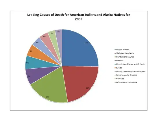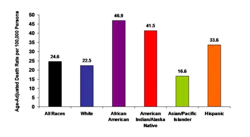 Though these diseases are also prevalent among non-Native Americans, some present a much greater threat to Native Americans' health.[5] In 2013, American Indians and Alaska Natives died at greater rates from: chronic liver disease and cirrhosis, diabetes mellitus, unintentional injuries, assault/homicide, intentional self-harm/suicide, and chronic lower respiratory diseases.[6] These discrepancies in disease patterns vary significantly among diseases, but have a significant effect on the population.