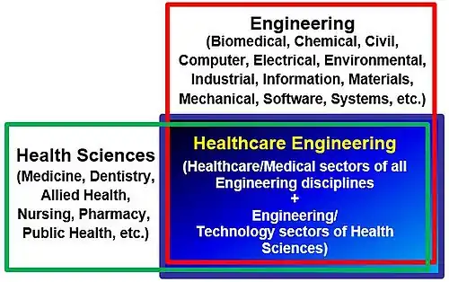 In its succinct definition, healthcare engineering is "engineering involved in all aspects of healthcare".[1] The term engineering in this definition covers all engineering disciplines such as biomedical, chemical, civil, computer, electrical, environmental, hospital architecture, industrial, information, materials, mechanical, software, and systems engineering.