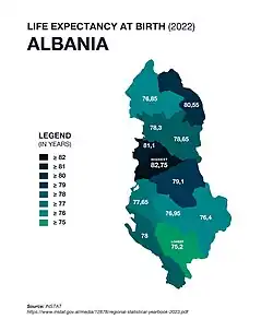 The life expectancy at birth in Albania, as of 2024, is 80 years old, which is high when compared to the life expectancy in Albania in 1960: 62 years old.[5] The region with the highest life expectancy at birth in 2022 was the capital city, Tirana, with 83 years.[6] This improvement in life expectancy gives insight into the drastic healthcare improvements that have been made in the country since the mid-1900s. The infant mortality rate in Albania in 2019 was only 8.9, an approximate 4 point decrease from 10 years prior.[7] Still, this rate is high in comparison to the mere 5.6 infant mortality rate in the United States.[8]