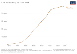 Costa Rica provides universal health care to its citizens and permanent residents.[1] Both the private and public health care systems in Costa Rica are continually being upgraded. Statistics from the World Health Organization (WHO) frequently place Costa Rica in the top country rankings in the world for long life expectancy. WHO's 2000 survey ranked Costa Rica as having the 36th best health care system, placing it one spot above the United States at the time.[2] In addition, the UN (United Nations) has ranked Costa Rica's public health system within the top 20 worldwide and the number 1 in Latin America.