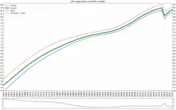 In 2010, spending on healthcare accounted for 2.2% of the country's GDP; the highest in the Middle East.[18] In 2006, there were 23.12 physicians and 61.81 nurses per 10,000 inhabitants.[19] The life expectancy at birth was 82.08 years in 2014, or 83.27 years for males and 77.95 years for females, rendering it the highest life expectancy in the Middle East.[20] Qatar has a low infant mortality rate of 7 in 100,000.[21]