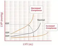 In diastolic heart failure, the volume of blood contained in the ventricles during diastole is lower than it should be, and the pressure of the blood within the chambers is elevated.[29]