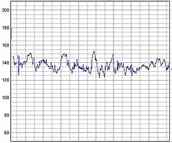In one 1993 study, 98% of cardiologists suggested that as a desirable target range, 50 to 90 beats per minute is more appropriate than 60 to 100.[23] The available evidence indicates that the normal range for resting heart rate is 50–90 beats per minute (bpm).[24][25][26][23] In a study of over 35,000 American men and women over age 40 during the 1999–2008 period, 71 bpm was the average for men, and 73 bpm was the average for women.[27]