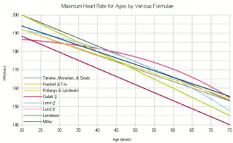 HRmax is strongly correlated to age, and most formulas are solely based on this.[38] Studies have been mixed on the effect of gender, with some finding that gender is statistically significant, although small when considering overall equation error, while others finding negligible effect.[44] The inclusion of physical activity status, maximal oxygen uptake, smoking, body mass index,[43] body weight, or resting heart rate[41] did not significantly improve accuracy. Nonlinear models are slightly more accurate predictors of average age-specific HRmax, particularly above 60 years of age, but are harder to apply, and provide statistically negligible improvement over linear models.[41][44] The Wingate formula is the most recent, had the largest data set, and performed best on a fresh data set when compared with other formulas, although it had only a small amount of data for ages 60 and older so those estimates should be viewed with caution.[44] In addition, most formulas are developed for adults and are not applicable to children and adolescents.[48]