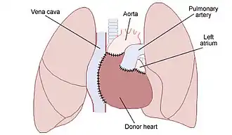 There are generally two types of procedure; orthotopic, involving removing the recipient's heart and implanting the donor's heart in the chest of the recipient, and heterotopic, involving leaving the recipient's heart where it is and attaching the donor heart to it.[18] Equipment required includes carefully selected recipient and donor, cardiopulmonary bypass, surgical instruments and qualified personnel.[18]
