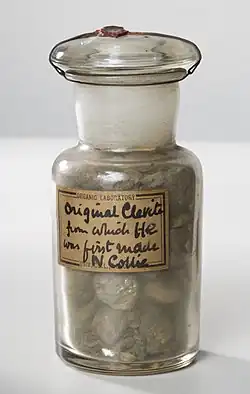On March 26, 1895, Scottish chemist Sir William Ramsay isolated helium on Earth by treating the mineral cleveite (a variety of uraninite with at least 10% rare-earth elements) with mineral acids. Ramsay was looking for argon but, after separating nitrogen and oxygen from the gas, liberated by sulfuric acid, he noticed a bright yellow line that matched the D3 line observed in the spectrum of the Sun.[29][35][36][37] These samples were identified as helium by Lockyer and British physicist William Crookes.[38][39] It was independently isolated from cleveite in the same year by chemists Per Teodor Cleve and Abraham Langlet in Uppsala, Sweden, who collected enough of the gas to accurately determine its atomic weight.[40][41][27][42] Helium was also isolated by American geochemist William Francis Hillebrand prior to Ramsay's discovery, when he noticed unusual spectral lines while testing a sample of the mineral uraninite. Hillebrand, however, attributed the lines to nitrogen.[43] His letter of congratulations to Ramsay offers an interesting case of discovery, and near-discovery, in science.[44]