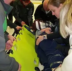 - ↑ Laprade RF, Schnetzler KA, Broxterman RJ, Wentorf F, Gilbert TJ (Nov–Dec 2000). "Cervical spine alignment in the immobilized ice hockey player. A computed tomographic analysis of the effects of helmet removal". Am J Sports Med. 28 (6): 800–3. doi:10.1177/03635465000280060601. PMID 11101101. S2CID 5901650.