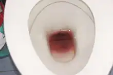 Hematochezia is a form of blood in stool, in which fresh blood passes through the anus while defecating. It differs from melena, which commonly refers to blood in stool originating from upper gastrointestinal bleeding (UGIB).[1] The term derives from Greek αἷμα ("blood") and χέζειν ("to defaecate"). Hematochezia is commonly associated with lower gastrointestinal bleeding, but may also occur from a brisk upper gastrointestinal bleed. The difference between hematochezia and rectorrhagia is that rectal bleeding is not associated with defecation; instead, it is associated with expulsion of fresh bright red blood without stools.[2] The phrase bright red blood per rectum is associated with hematochezia and rectorrhagia.