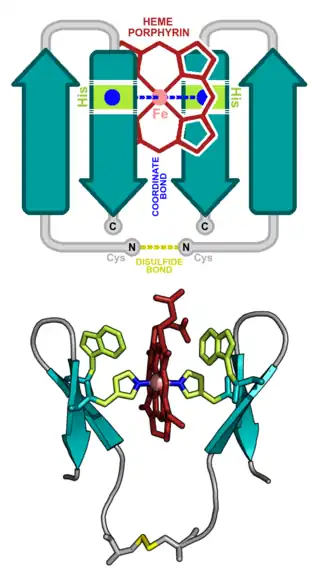 - ↑ Huang SS, Koder RL, Lewis M, Wand AJ, Dutton PL (April 2004). "The HP-1 maquette: from an apoprotein structure to a structured hemoprotein designed to promote redox-coupled proton exchange". Proceedings of the National Academy of Sciences of the United States of America. 101 (15): 5536–5541. doi:10.1073/pnas.0306676101. PMC 397418. PMID 15056758.