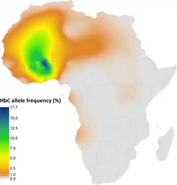Hemoglobin C is found most abundantly in areas of West Africa, such as Nigeria, where Yorubas live.[15][16][17] Hemoglobin C gene is found in 2-3% of African-Americans[4] while 8% of African-Americans have hemoglobin S (Sickle) gene. Thus Hemoglobin SC disease is significantly more common than Hemoglobin CC disease. The trait also affects people whose ancestors came from Italy, Greece, Latin America, and the Caribbean region.[4] However, it is possible for a person of any race or nationality to have hemoglobin C trait. In terms of geographic distribution, the hemoglobin C allele is found at the highest frequencies in West Africa, where it has been associated with protection against malaria.[3] Hemoglobin C disease is present at birth, though some cases may not be diagnosed until adulthood. Both males and females are affected equally.[6]