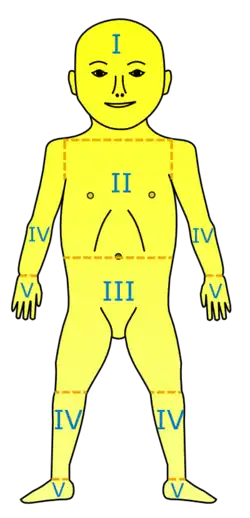 In both newborns and adults, yellowing of the skin is a marker for jaundice.[27] As most cases of jaundice are observed in newborns, healthcare workers use visual methods to identify the presence of this condition.[29] A clinical jaundice scale, an adapted version of the Kramer's scale, is used to quantify the severity of jaundice through the spread of skin discoloration from zone 1, the head, to zone 5, the palms and soles of the neonate's body.[29][30] Cephalocaudal progression of jaundice to zone 4 and 5 of the Kramer's scale shows a significant positive correlation with serum bilirubin concentration of at least 11.0mg per 100 ml, indicating the need for treatment.[29]