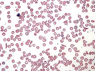 Blood smear of a patient with sickle cell disease. The characteristic sickle-shaped appearance of red blood cells can be observed.Sickle cell disease, in which a mutation in the globin gene causes the formation of sickle hemoglobin.[2] This disease is marked by the manifestation of chronic compensated hemolytic anemia, with laboratory findings not limited to unconjugated hyperbilirubinemia but also elevated serum lactate dehydrogenase and low serum haptoglobin.[2]