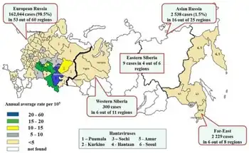 - ↑ Tkachenko, Evgeniy; Kurashova, Svetlana; Balkina, Alexandra; Ivanov, Alexander; Egorova, Mariya; Leonovich, Oksana; Popova, Yulia; Teodorovich, Rostislav; Belyakova, Alla; Tkachenko, Petr; Trankvilevsky, Dmitriy; Blinova, Ekaterina; Ishmukhametov, Aydar; Dzagurova, Tamara (12 July 2023). "Cases of Hemorrhagic Fever with Renal Syndrome in Russia during 2000-2022". Viruses. 15 (7): 1537. doi:10.3390/v15071537. ISSN 1999-4915. PMC 10383633. PMID 37515224.
