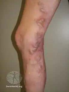 Hemosiderin or haemosiderin is an iron-storage complex that is composed of partially digested ferritin and lysosomes. The breakdown of heme gives rise to biliverdin and iron.[1][2] The body then traps the released iron and stores it as hemosiderin in tissues.[3] Hemosiderin is also generated from the abnormal metabolic pathway of ferritin.[3]