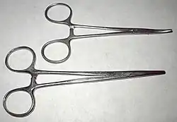 A hemostat (also called a hemostatic clamp; arterial forceps; and pean, after Jules-Émile Péan) is a tool used to control bleeding during surgery.[1] Similar in design to both pliers and scissors, it is used to clamp exposed blood vessels shut.